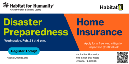 Habitat for Humanity Greater Orlando and Osceola County is hosting a Habitat U Disaster Preparedness & Home Insurance class on Wednesday, February 21 at 6 p.m. This free class will cover how to protect your home from disaster and the ABCs of home insurance. You’ll also learn about our Habitat Inspects program. The class is free, but space is limited so register today and gain knowledge useful to being a responsible and successful homeowner. https://bit.ly/habitatuclasses